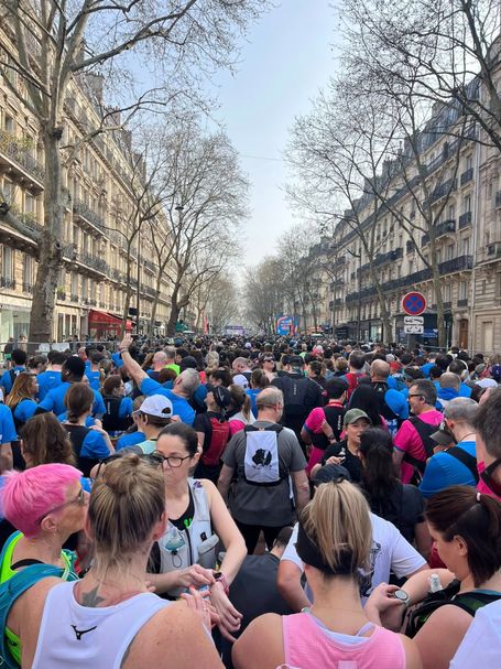 Our first Weston Whippets European running event was the Hoka Semi de Paris. Reputed to be the world’s largest half-marathon, this race is incredibly massive, with close to 50,000 runners. Start times vary, ranging from 8:00 AM to 11:24 AM. Some of the first finishers were already heading back to our hotel with their medals before we even set off to walk to our starting area.